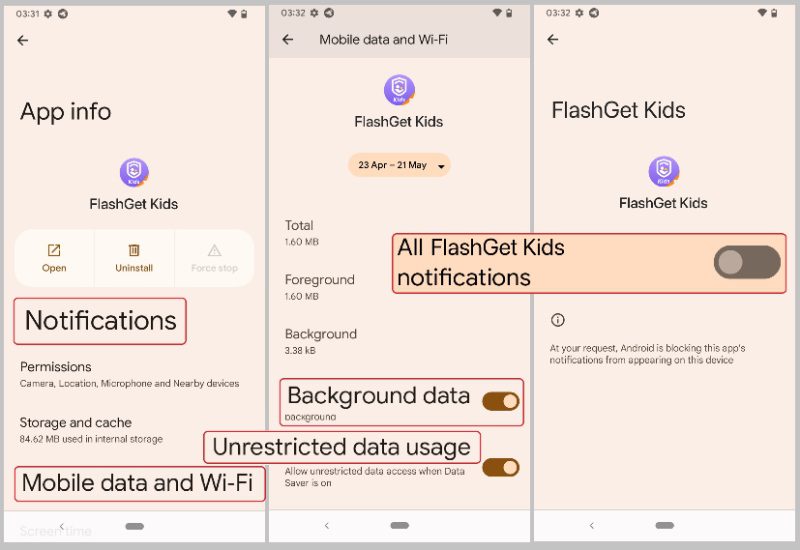 Go to Settings > Apps & notifications and find FlashGet Kids to adjust the following settings.